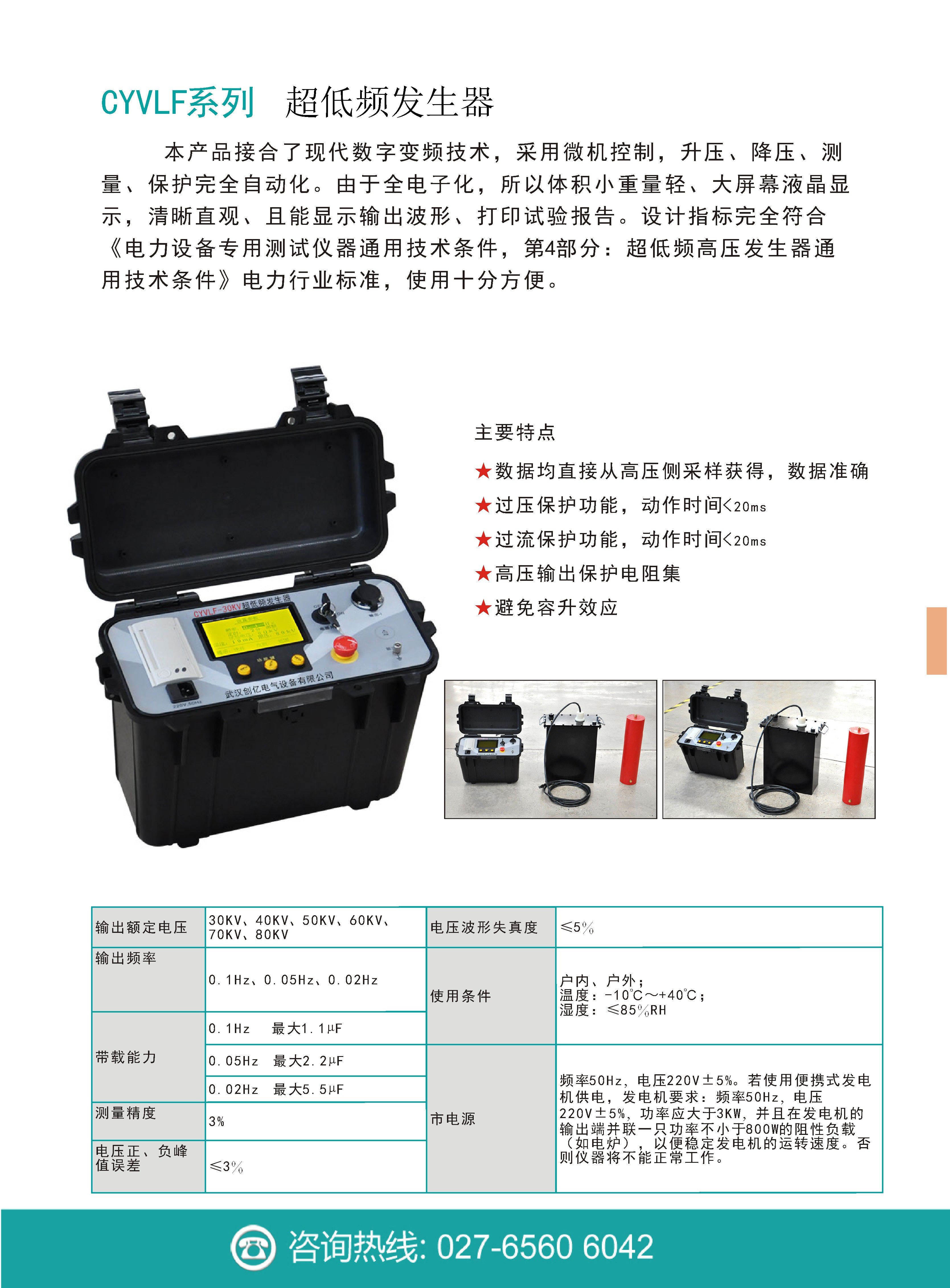 本產品接合了現代數字變頻先進技術,采用微機控制,升壓、降壓、測量、保護完全自動化。由于全電子化,所以體積小重量輕、大屏幕液晶顯示,清晰直觀、且能顯示輸出波形、打印試驗報告。設計指標完全符合《電力設備測試儀器通用技術條件,第4部分:超低頻高壓發生器通用技術條件》電力行業標準,使用十分方便。現在國內外均采用機械式的辦法進行調制和解調產生超低頻信號,所以存在正弦波波形不標準,測量誤差大,高壓部分有火花放電,設備笨重,而且正弦波的二,四象限還需要大功率高壓電阻進行放電整形,所以設備的整體功耗較大。本產品均能克服這樣一些不足之處,另外,還有如下特點需要特別說明: