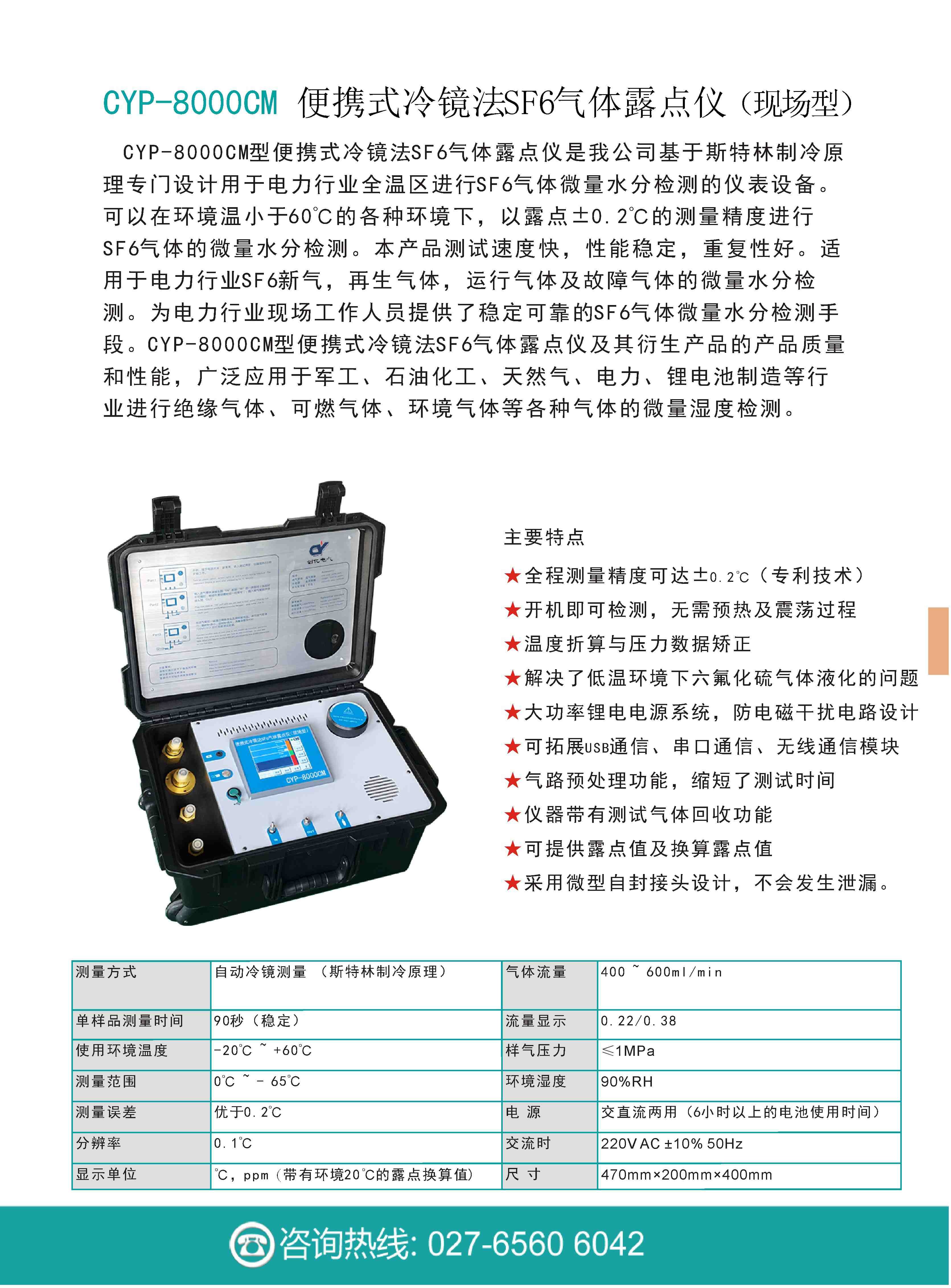便攜式冷鏡法SF6氣體露點(diǎn)儀是我公司基于斯特林制冷原理專(zhuān)門(mén)設(shè)計(jì)用于電力行業(yè)全溫區(qū)進(jìn)行SF6氣體微量水分檢測(cè)的儀表設(shè)備。可以在環(huán)境溫小于60℃的各種環(huán)境下,以露點(diǎn)±0.2℃的測(cè)量精度進(jìn)行SF6氣體的微量水分檢測(cè)。本產(chǎn)品測(cè)試速度快,性能穩(wěn)定,重復(fù)性好。適用于電力行業(yè)SF6新氣,再生氣體,運(yùn)行氣體及故障氣體的微量水分檢測(cè)。為電力行業(yè)現(xiàn)場(chǎng)工作人員提供了穩(wěn)定可靠的SF6氣體微量水分檢測(cè)手段。便攜式冷鏡法SF6氣體露點(diǎn)儀及其衍生產(chǎn)品以其優(yōu)異的產(chǎn)品質(zhì)量和性能,廣泛應(yīng)用于軍工、石油化工、天然氣、電力、鋰電池制造等行業(yè)進(jìn)行絕緣氣體、可燃?xì)怏w、環(huán)境氣體等各種氣體的微量濕度檢測(cè)。