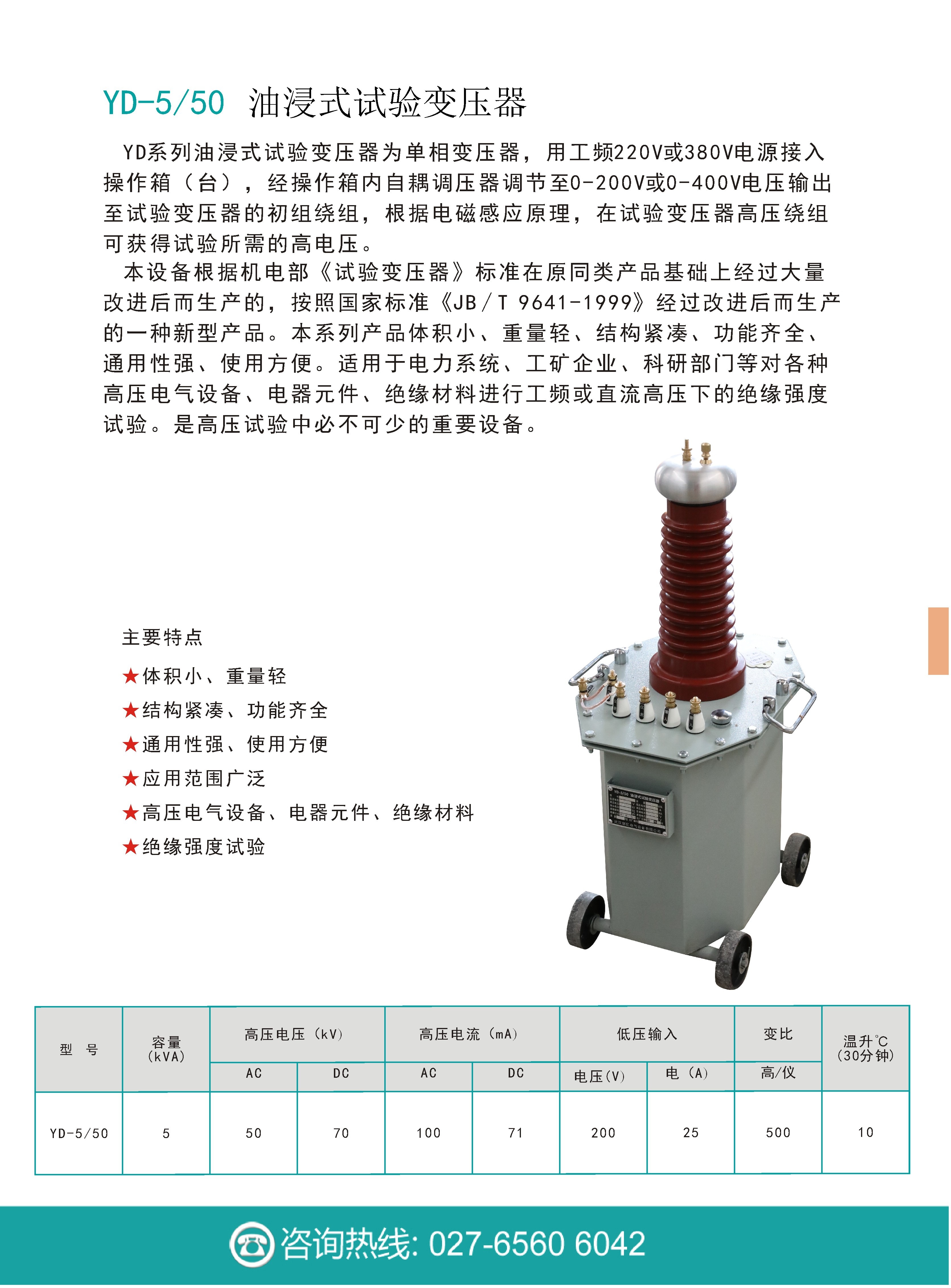 YD-5/50油浸式試驗(yàn)變壓器為單相變壓器,用工頻220V電源接入操作箱,經(jīng)操作箱內(nèi)自耦調(diào)壓器調(diào)節(jié)至0-200V電壓輸出至試驗(yàn)變壓器的初組繞組,根據(jù)電磁感應(yīng)原理,在試驗(yàn)變壓器高壓繞組可獲得試驗(yàn)所需的高電壓。