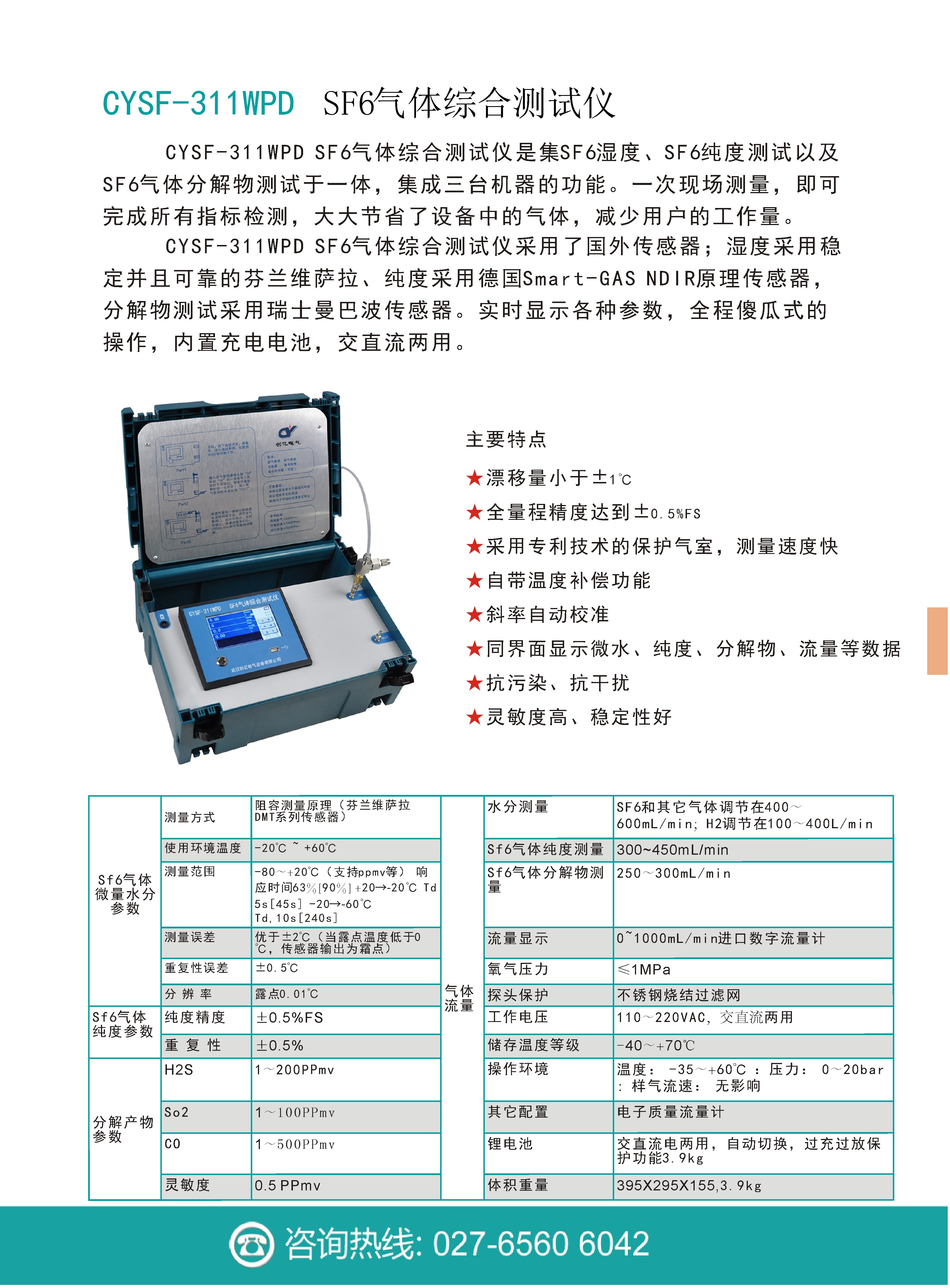 CYSF-311WPD SF6氣體綜合測試儀是集SF6濕度、SF6純度測試以及SF6氣體分解物測試于一體,將原來要用三臺儀器才能實現(xiàn)的功能,集中在一臺儀器。一次現(xiàn)場測量,即可完成所有指標(biāo)檢測,大大節(jié)省了設(shè)備中的氣體,同時減少用戶的工作量,提高了工作效率。