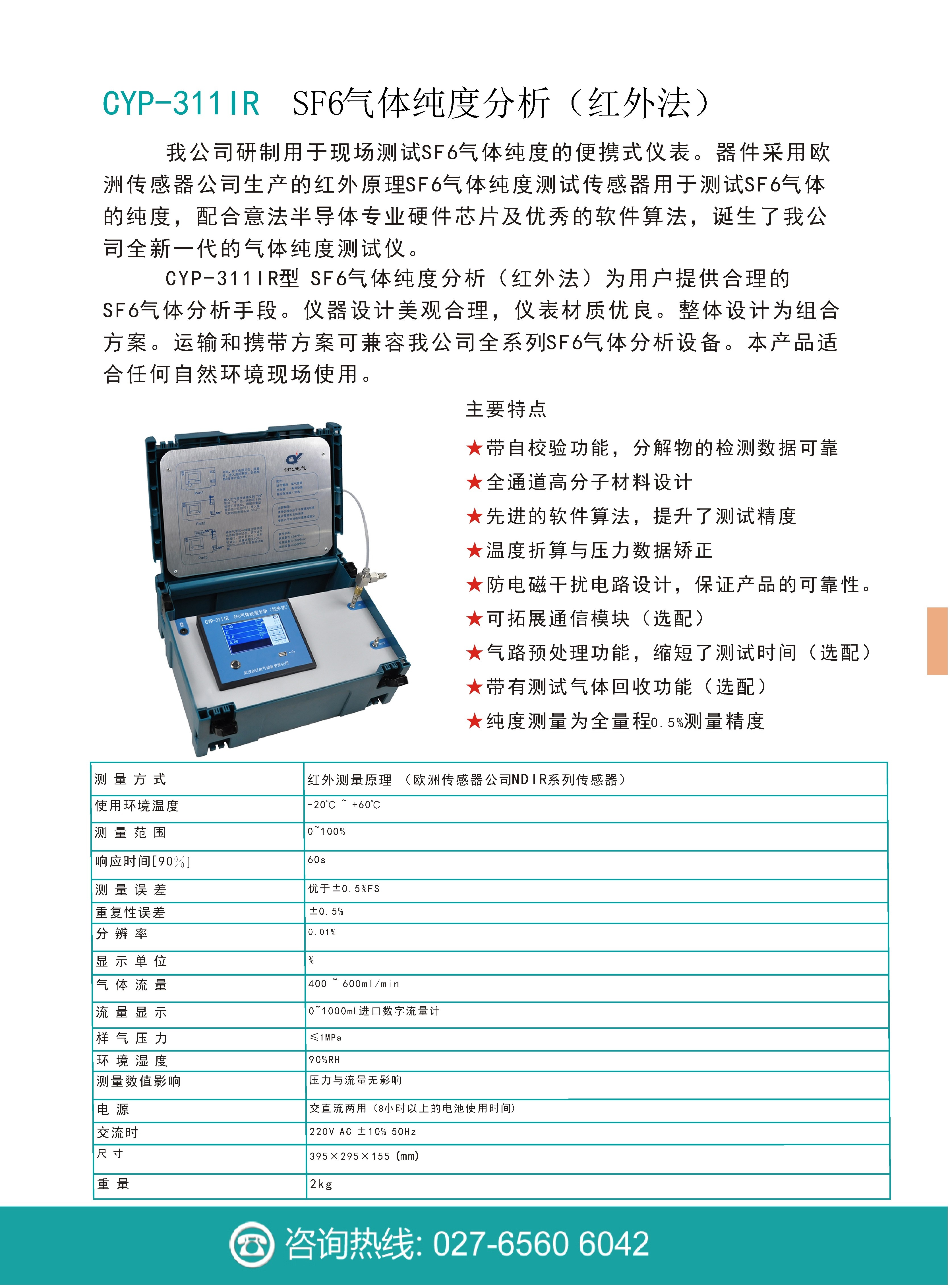 CYP-311IR紅外法SF6氣體純度分析儀為用戶提供合理,高效的SF6氣體分析手段。儀器設計美觀合理,儀表材質優良。整體設計為組合方案。運輸和攜帶方案可兼容我公司全系列SF6氣體分析設備。本產品適合任何自然環境現場使用。