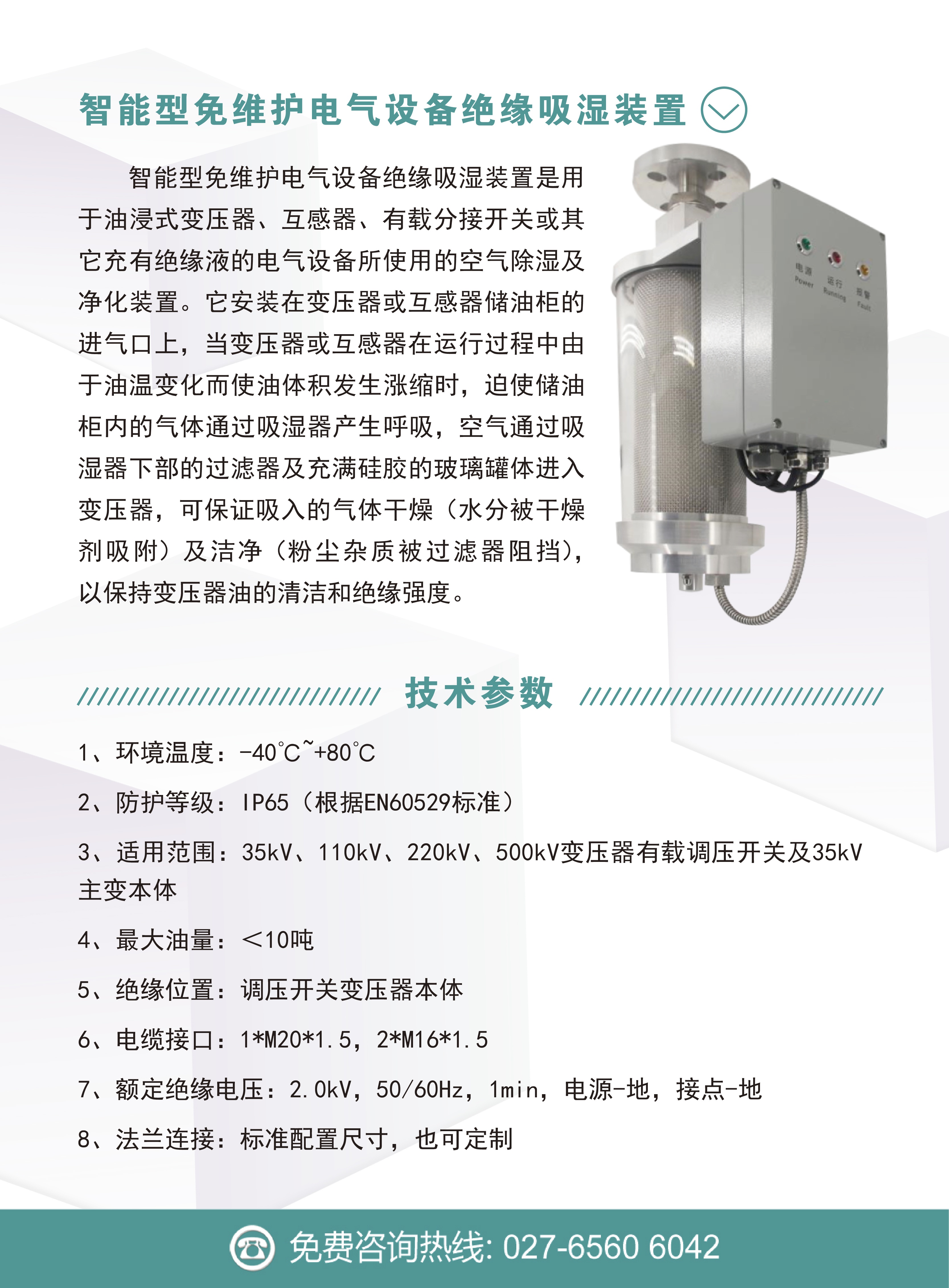 智能型免維護電氣設備絕緣吸濕裝置是用于油浸式變壓器、互感器、有載分接開關或其它充有絕緣液的電氣設備所使用的空氣除濕及凈化裝置。它安裝在變壓器或互感器儲油柜的進氣口上,當變壓器或互感器在運行過程中由于油溫變化而使油體積發(fā)生漲縮時,迫使儲油柜內的氣體通過吸濕器產(chǎn)生呼吸,空氣通過吸濕器下部的過濾器及充滿硅膠的玻璃罐體進入變壓器,可保證吸入的氣體干燥(水分被干燥劑吸附)及潔凈(粉塵雜質被過濾器阻擋),以保持變壓器油的清潔和絕緣強度。
